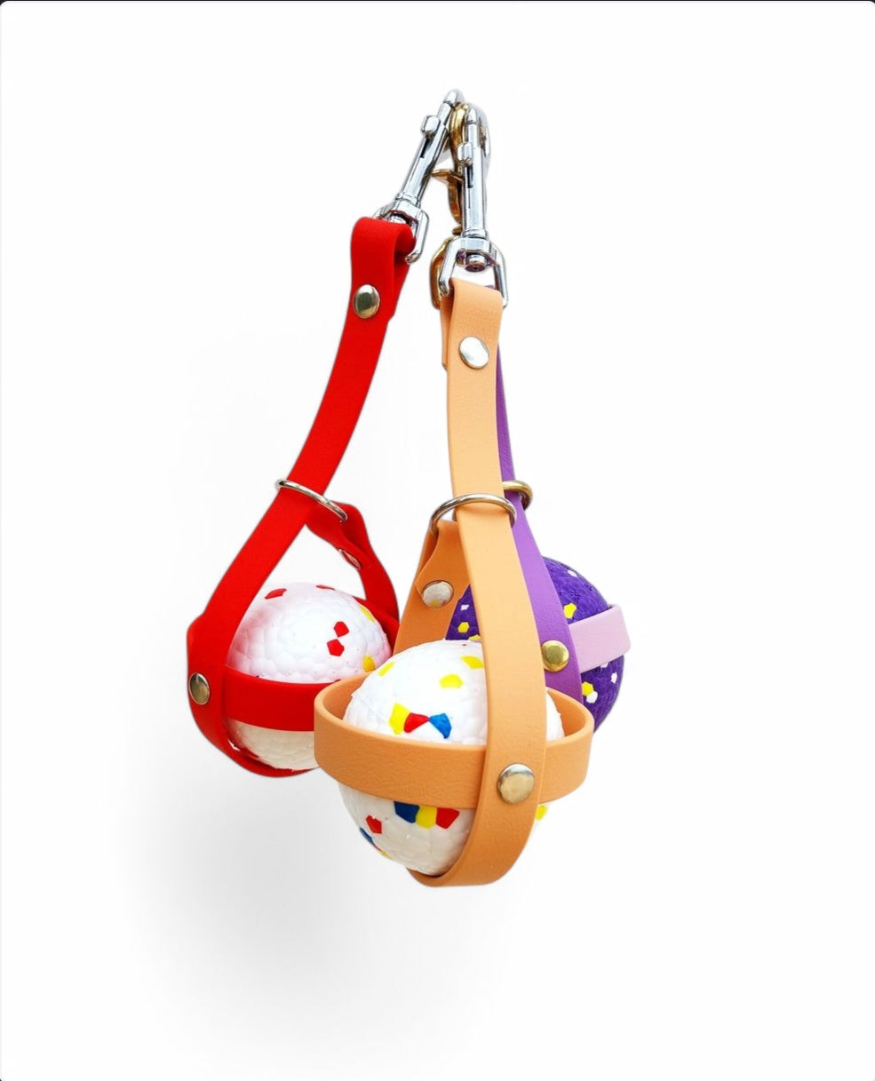 ¡adiós a las manos mojadas y babosas después de que tu peludx juegue con la pelota! Engancha este soporte a la correa o cinturón mientras sale a jugar. Hecho de cuero vegano resistente al agua y anti olor.